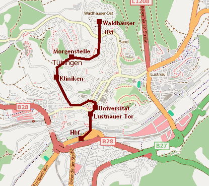 | Rote Linie | : | Bahnhof <> Bahnhofstraße <> Marktplatz <> Ludwigsplatz <> Artilleriekaserne |